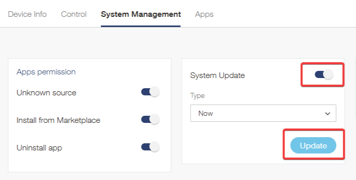 Objective: Remotely enable/disable “System Update” on Optoma-managed devices, and trigger a system update via OMS API.